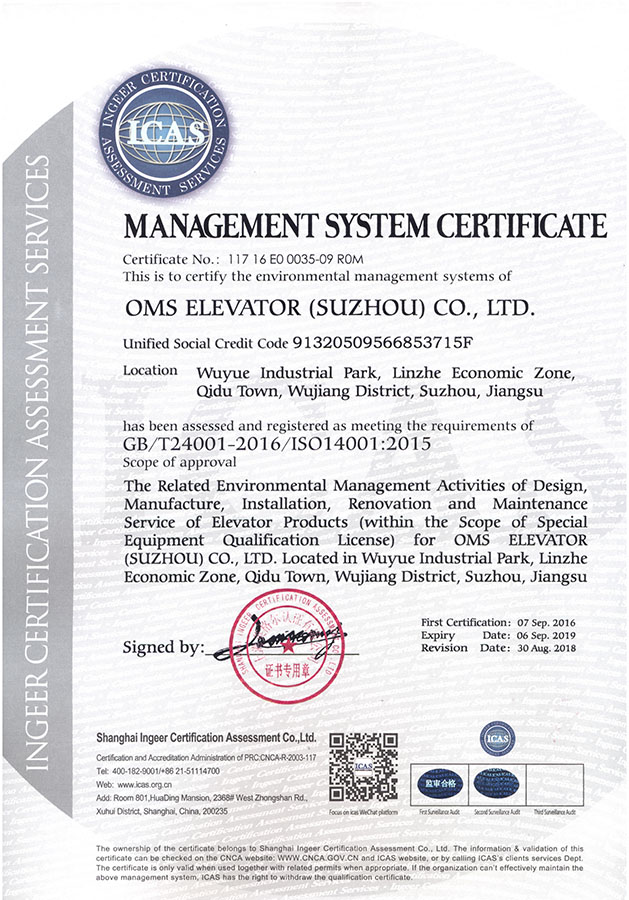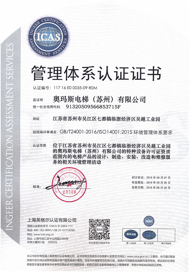 环境管理体系认证证书