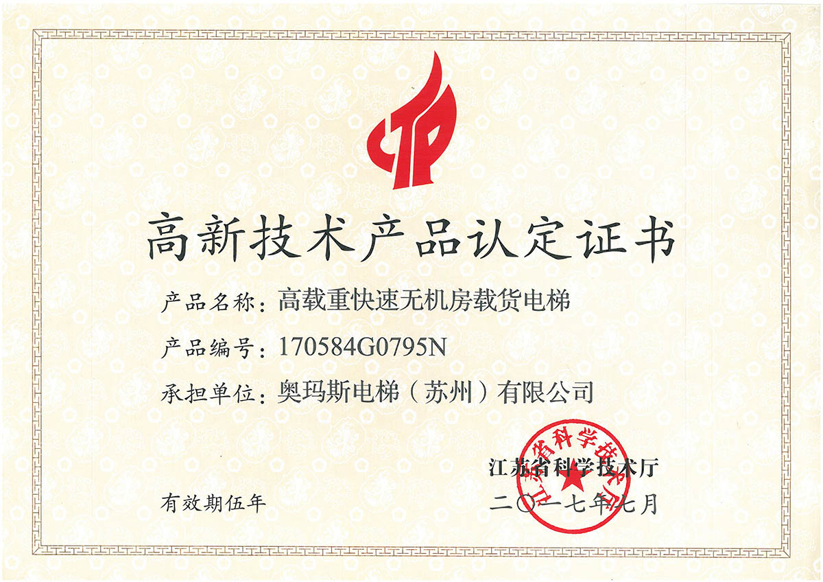 载货电梯高新技术产品证书