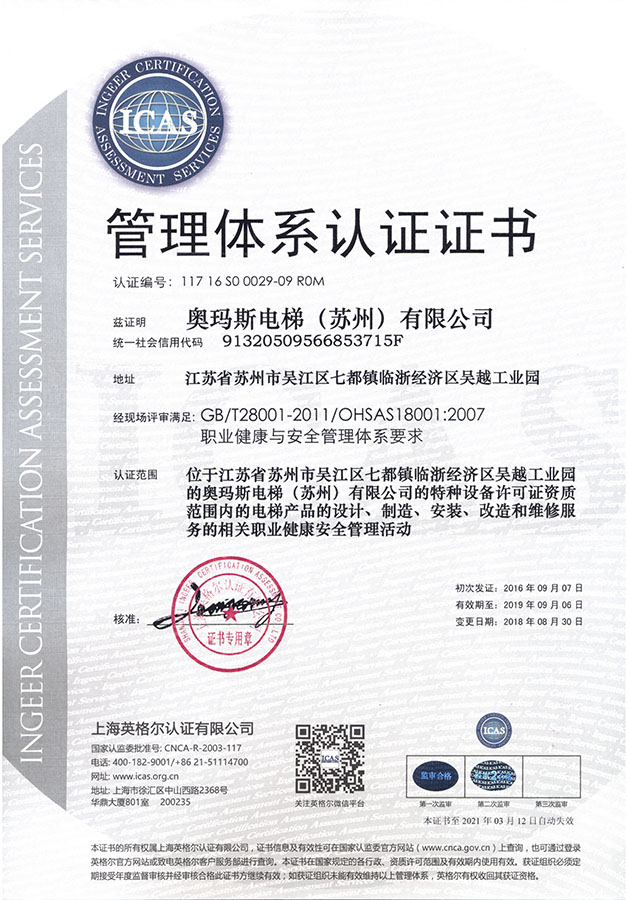 职业健康与安全管理体系认证证书