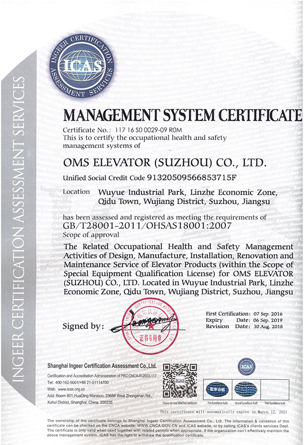 职业健康与安全管理体系认证证书-英文