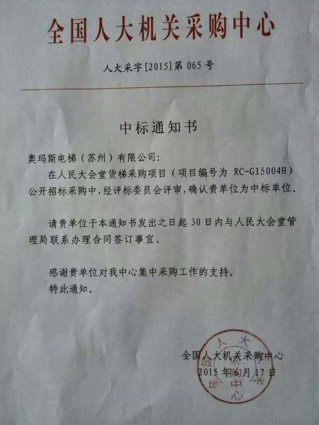 2015年6月17日,对于乐鱼注册-乐鱼(中国)电梯公司而言这是一个鼓舞人心的好日子。我们从全国人大机关采购中心获得最终确认信息:乐鱼注册-乐鱼(中国)电梯(苏州)有限公司在北京人民大会堂1台4000KG,1.0M/S,5层站载货电梯(项目编号为:RC-G15004H)的公开招投标活动中一举获胜,成功中标 (详见”中标通知书”) 。