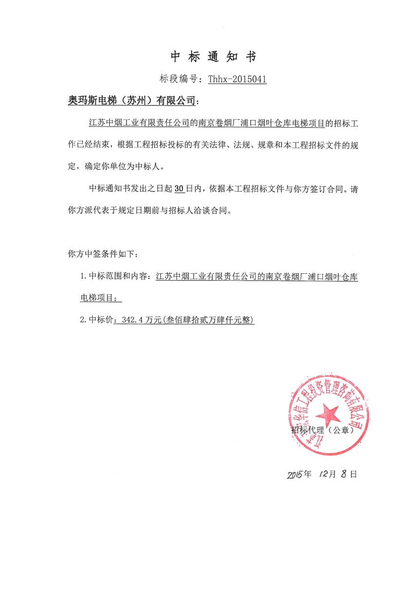图4:江苏中烟工业有限责任公司南京烟厂浦口烟叶仓库电梯项目中标通知书