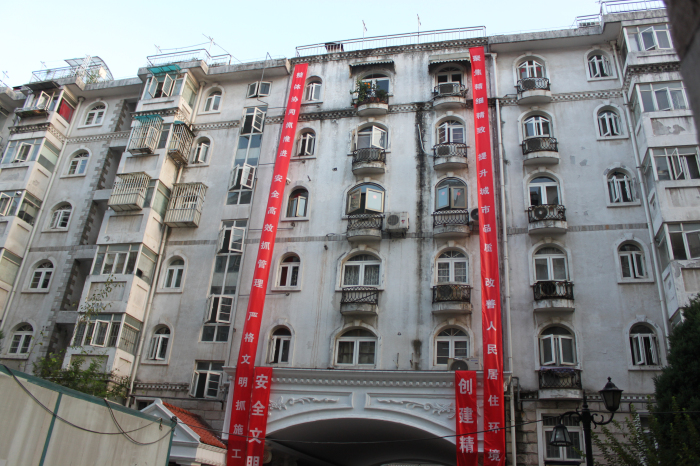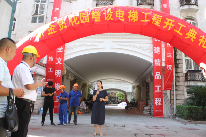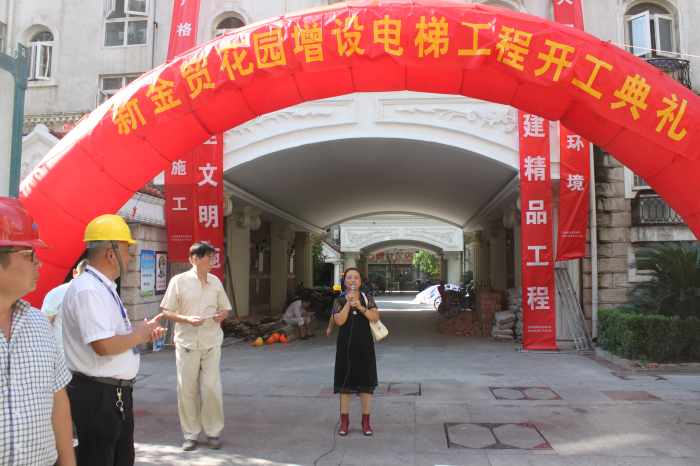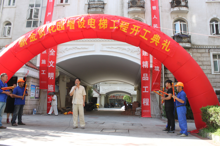 2017年8月24日上午8:00时分,南京市区风和日丽,位于南京市鼓楼区的新金贸花园小区主道路两旁一派喜庆热闹的景象:一个大大的拱形大红气球门上写着“新金贸花园增设电梯工程开工典礼”几个醒目的大字。4条长长的横幅分别从7楼顶处及2楼处高挂而下,横幅上“创建精品工程,安全文明施工”这些白色的大字同样引人注目。