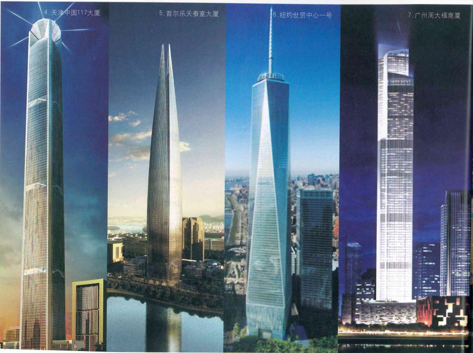 4-597米天津中国117大厦,5-556米首尔乐天蚕室大厦,6-541米纽约世贸中心一号,7-530米广州周大福商厦