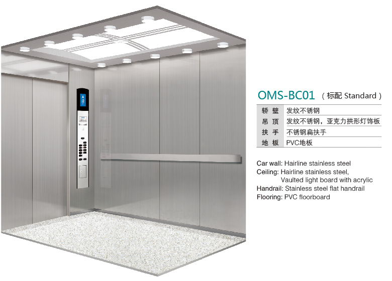 轿壁:发纹不锈钢; 吊顶:发纹不锈钢,亚克力拱形灯饰板; 扶手:不锈钢扁扶手; 地板:PVC地板。